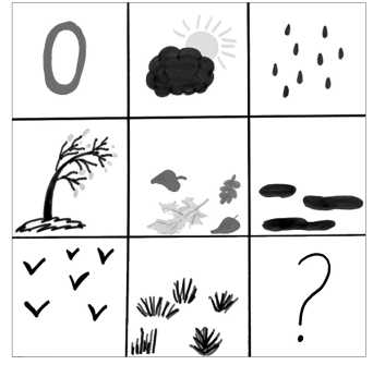 Учні називають ознаки осені, учитель, розділивши аркуш паперу на 9 квадратів, малює схематично те, про що розповідають діти.