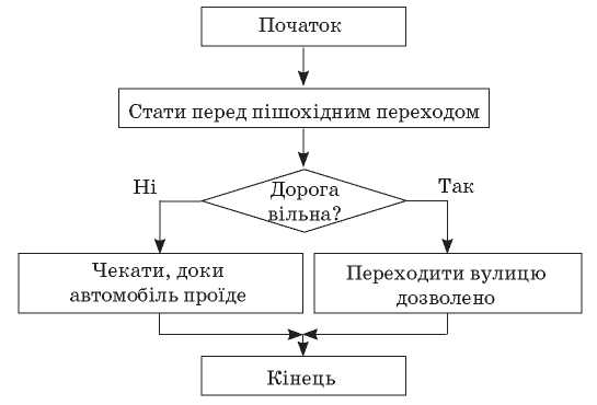 — Складіть алгоритм переходу вулиці на пішохідному переході без світлофора.