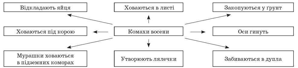 Висновок. Восени одні комахи відкладають яйця і гинуть. Інші, щоб пережити зиму, прилаштовуються у затишному місці. Підготовка комах до зими — це приклад осінніх явищ у живій природі.