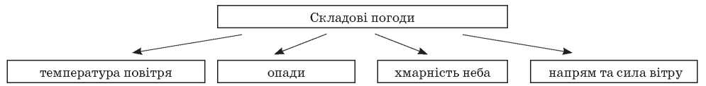 — Для розповіді використайте слова: тепло, холодно, морозно, ясно, хмарно, сніг, дощ, сніг з дощем, сильний вітер, без вітру, метелиця, іній.