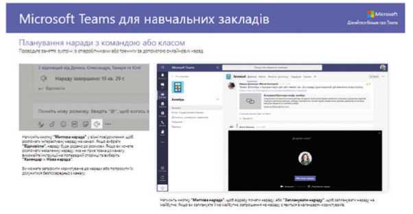 Було запропоновано ознайомитись з навігацією додатка, скориставшись інструкцією Teams for Education. Надзвичайно важливим є те, що один додаток MS Teams об’єднує можливість реалізації всіх варіантів співпраці, яка необхідна в умовах навчання дистанційно. Огляд досвіду впровадження можна переглянути за посиланням https://youtu.be/5FbMV3itjWY та презентовано на всеукраїнському заході «Марафон 365».