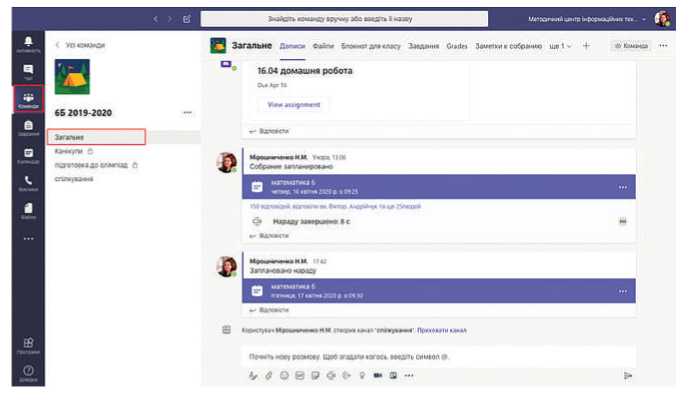 Вчитель отримує предметні команди класів (рис. 12, 13), в яких викладає, можливість в одному додатку розміщувати навчальні матеріали, створювати завдання різного типу, в тому числі тестів з автоматичною перевіркою за допомогою Microsoft Forms.