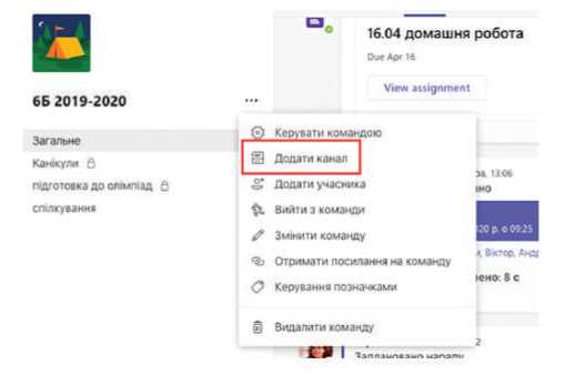 Для роботи над різноманітними проектами, що не потребують участі всіх учасників групи, можна створювати нові канали. Щоб створити додатковий канал, потрібно зайти у налаштування команди (рис. 16).