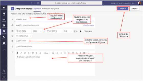 Використання Microsoft Teams дає можливість спілкування у режимі реального часу. Вчитель має можливість створювати конференції. Проведіть миттєву нараду або заплануйте конференцію на обраний день і час. Для цього потрібно зайти у календар та натиснути кнопку СТВОРИТИ НАРАДУ (рис. 17).